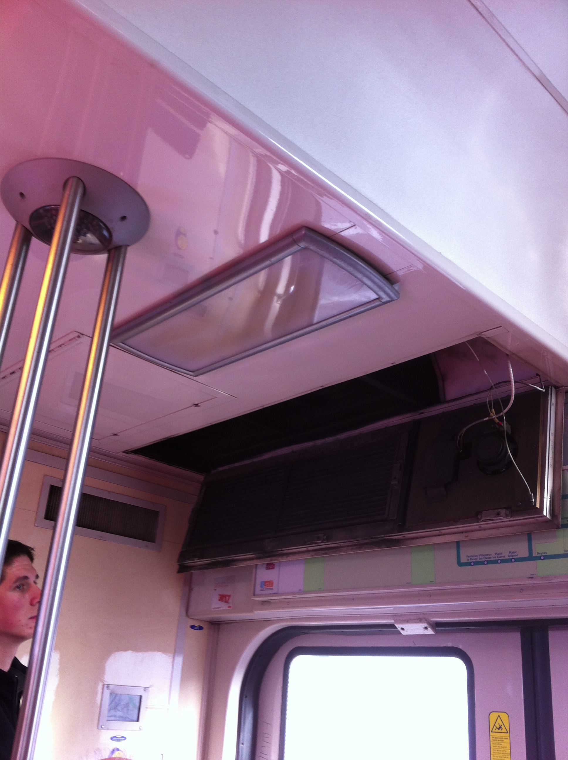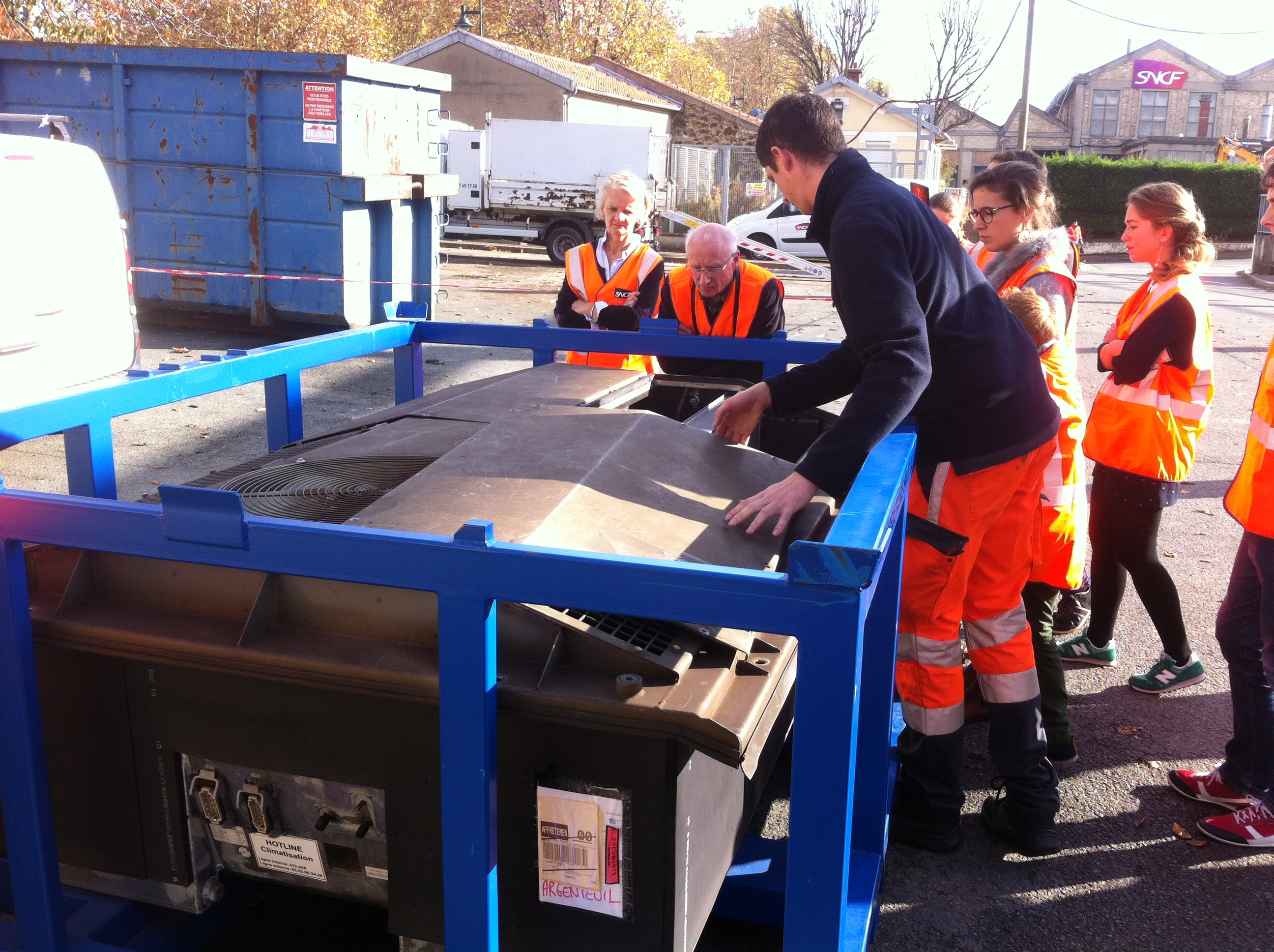 Après un intéressant exposé théorique en salle sur le fonctionnement du système de chauffage / climatisation de nos rames VB2N, notre intervenant nous a présenté un groupe HVAC déposé et nous en a détaillé les divers constituants. Puis nous sommes monté en rame où l’on nous a présenté les diverses armoires électriques ainsi que divers éléments discrètement implantés (sondes de température) qui concourent au bon fonctionnement des groupes.