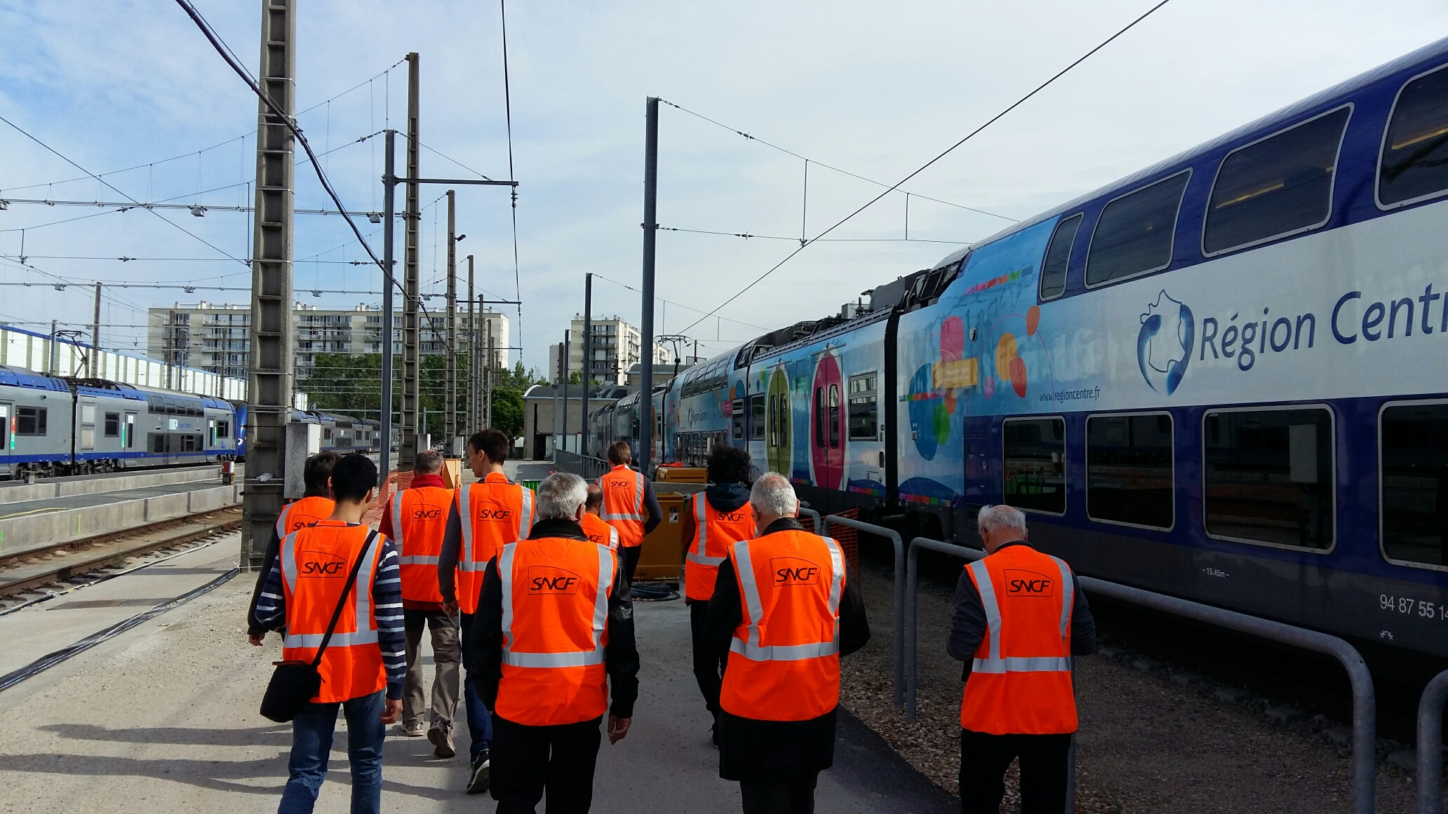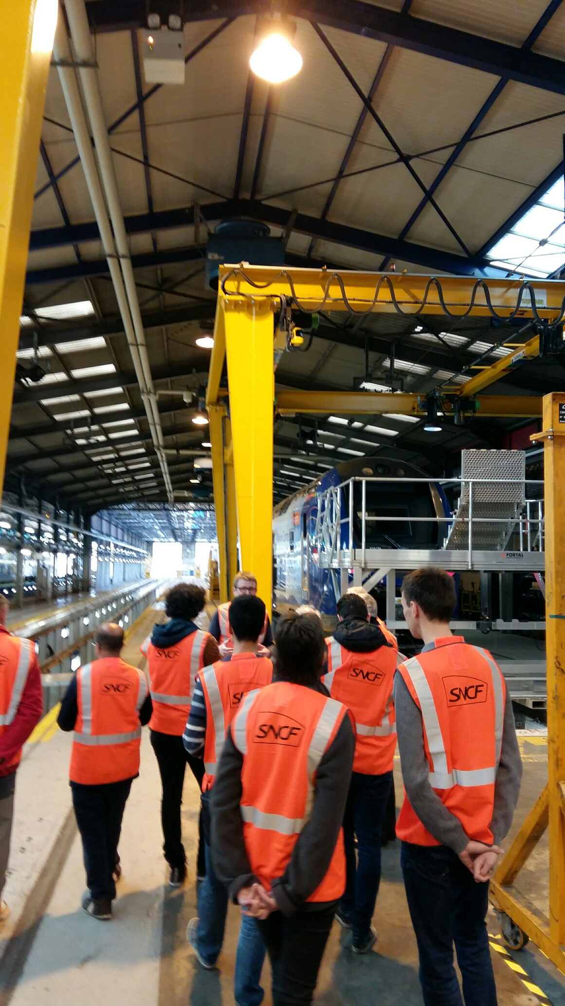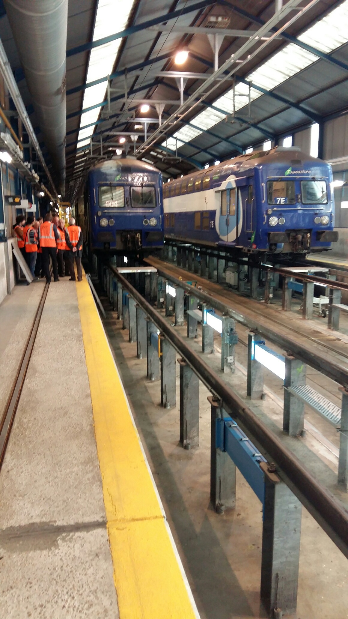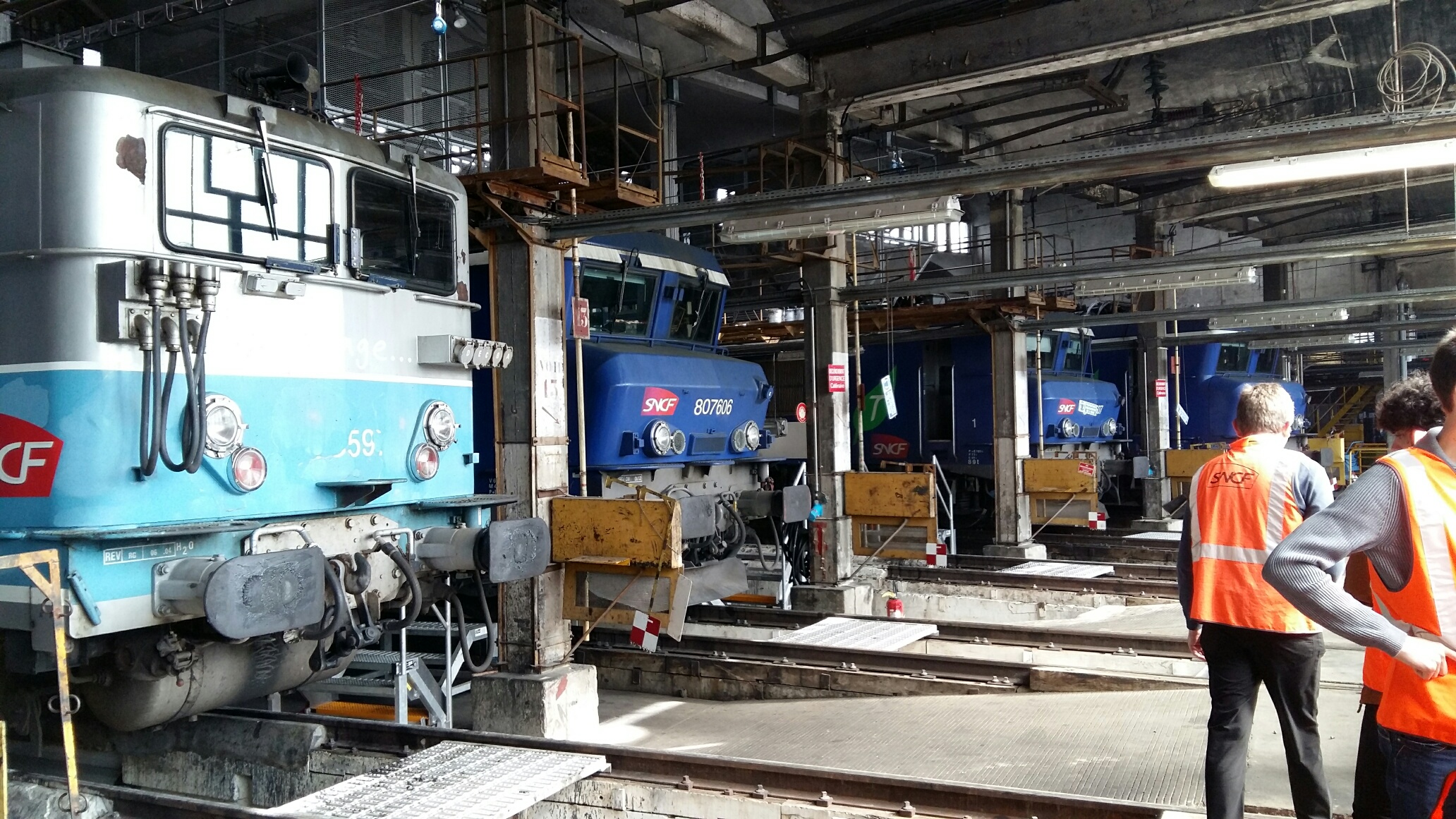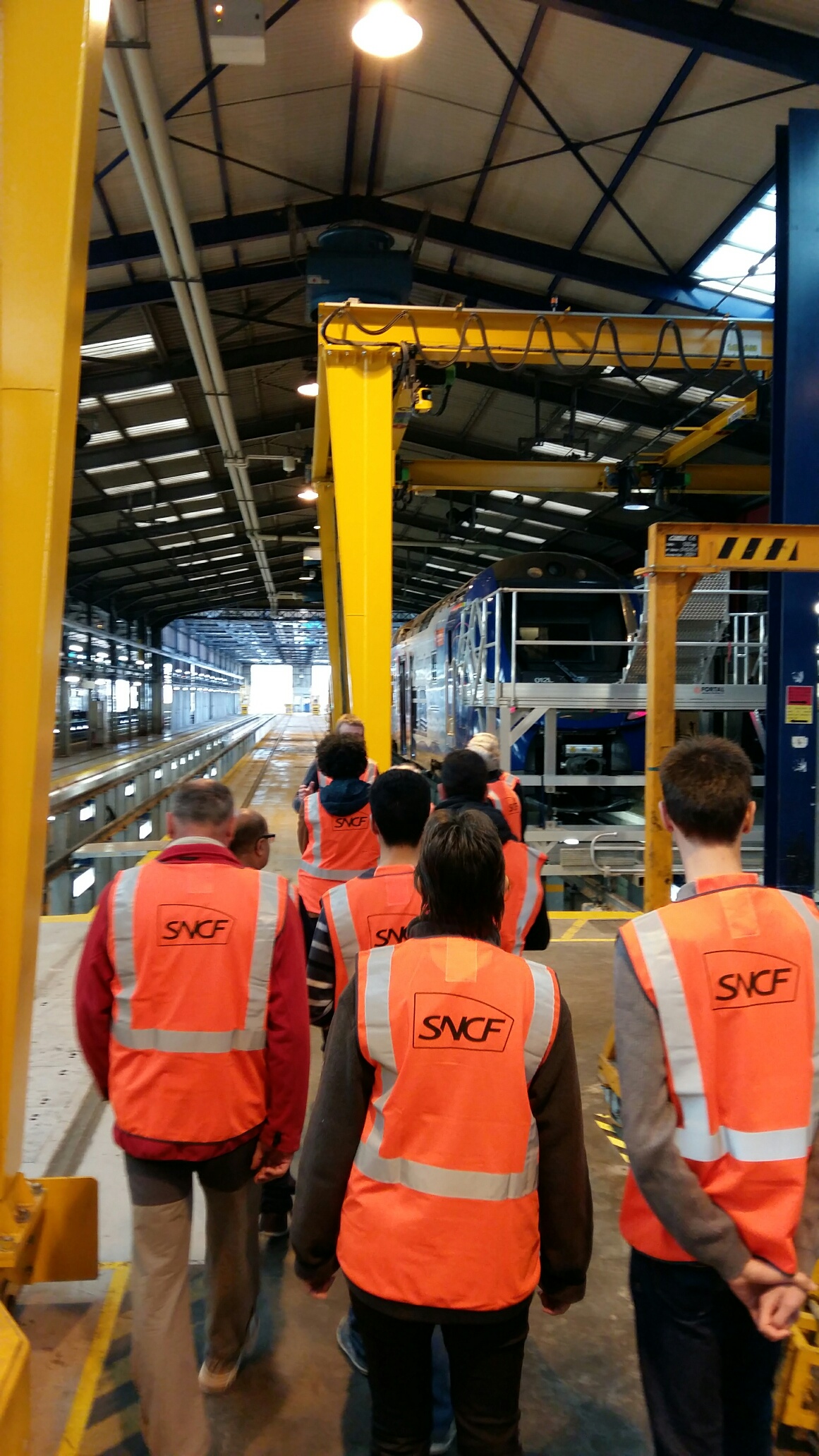 Ce matin, visite très intéressante au centre de maintenance de Montrouge. C’est quand même rare de pouvoir observer son train par dessous les caisses et voir comment c’est fait en dessous. Nous avons pu voir de près les organes de freinage, disques et sabots de freins ( 5 Kg le sabot en fonte, c’est pas rien ), ainsi que les capteurs de vitesse montés en bout d’essieux et qui entrent dans la chaîne de fonctionnement des anti-enrayeurs (le tuc qui fait que le train ne « dérape » plus sur les feuilles mortes !). Nous avons aussi été invité à pénétrer dans l’antre des grosses réparations : la rotonde où nombre de locomotives étaient en auscultation, dont une 7600 en levage, bogies ôtés. Impressionnant ! De là, nous sommes monté dans la cabine d’une voiture pilote VB2N ou notre guide nous a instruit sur les différents systèmes d’informations ainsi que sur le fonctionnement du signal d’alarme. Un grand merci à notre guide et aux organisateurs de cette visite riche en informations.