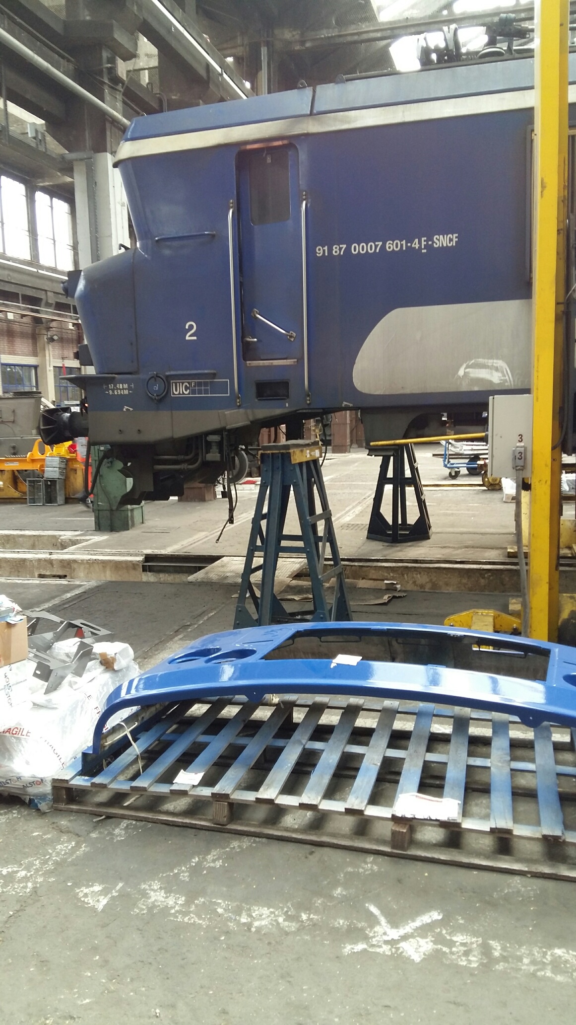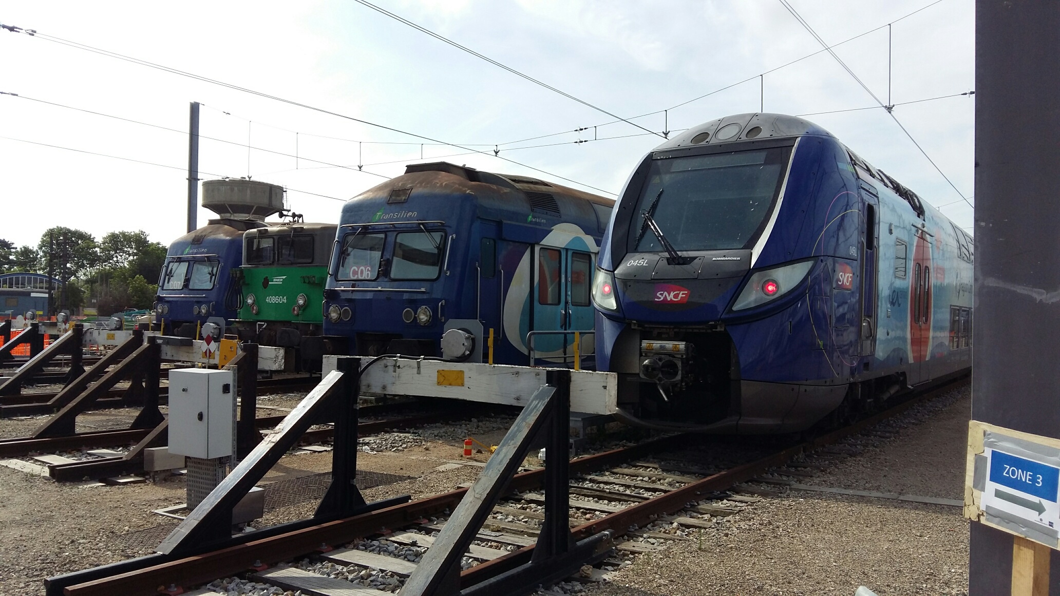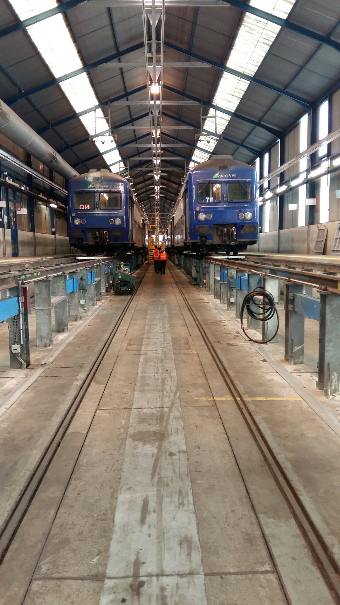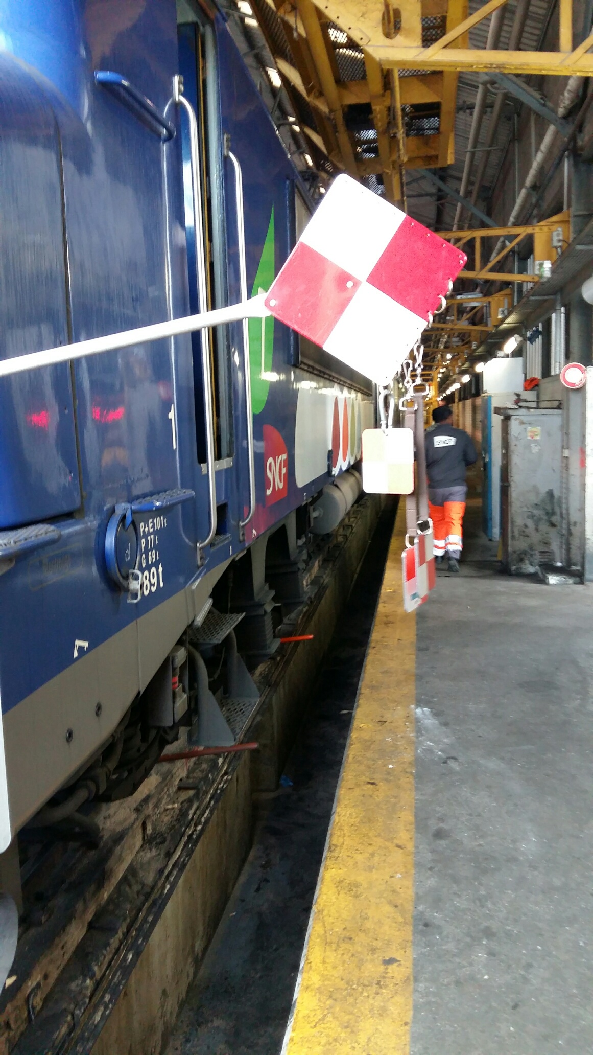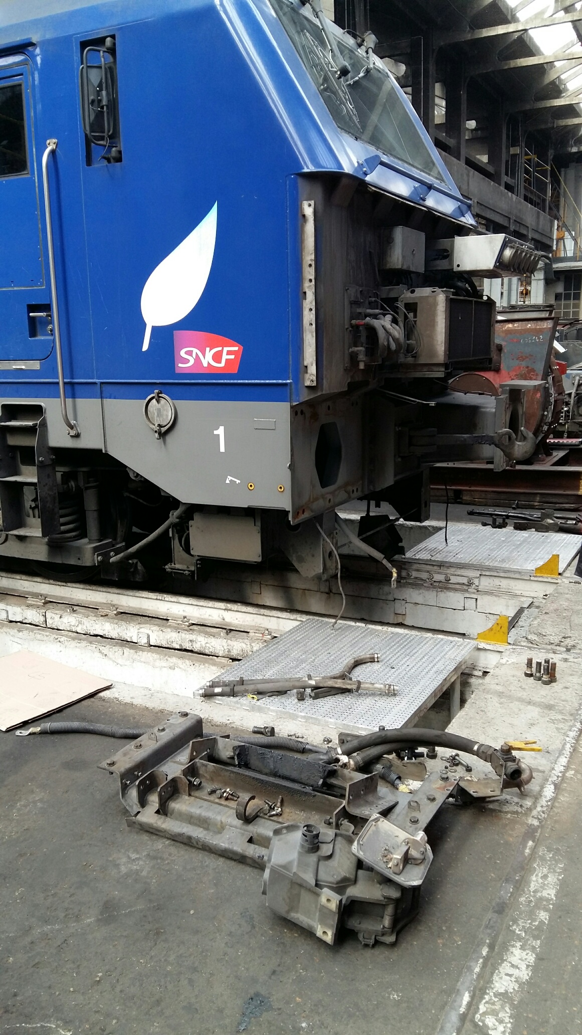 Ce matin, visite très intéressante au centre de maintenance de Montrouge. C’est quand même rare de pouvoir observer son train par dessous les caisses et voir comment c’est fait en dessous. Nous avons pu voir de près les organes de freinage, disques et sabots de freins ( 5 Kg le sabot en fonte, c’est pas rien ), ainsi que les capteurs de vitesse montés en bout d’essieux et qui entrent dans la chaîne de fonctionnement des anti-enrayeurs (le tuc qui fait que le train ne « dérape » plus sur les feuilles mortes !). Nous avons aussi été invité à pénétrer dans l’antre des grosses réparations : la rotonde où nombre de locomotives étaient en auscultation, dont une 7600 en levage, bogies ôtés. Impressionnant ! De là, nous sommes monté dans la cabine d’une voiture pilote VB2N ou notre guide nous a instruit sur les différents systèmes d’informations ainsi que sur le fonctionnement du signal d’alarme. Un grand merci à notre guide et aux organisateurs de cette visite riche en informations.