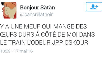 Alors ok, l’odeur de l’œuf dur, ya plus glamour, mais quand tu n’as pas le choix que d’avaler un casse croûte sur le pouce, dans le calme et assis, t’en a un peu rien à foutre que l’odeur de l’œuf dérange quelqu’un. Pour exemple, je déteste l’odeur des agrumes, et j’en fais pas tout un plat en hiver quand des gens en font leur goûter dans les rames en période hivernale.
