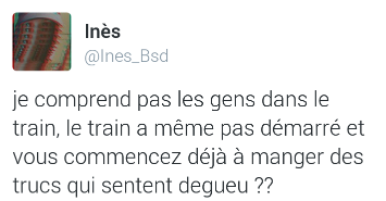 Bientôt, faudra demander aux gens d’arrêter de respirer dans les trains, ou de ne pas porter de couleur bleue parce que ça donne des crises d’épilepsie. Il y a incivilités et incivilités. Le bruit, les urines (tiens, si vous remettiez les WC dans les rames au passage ?) les pieds sur les sièges, le tabac sont des nuisances et des incivilités. Déjeuner, quand c’est fait proprement, pour moi n’en est pas une.