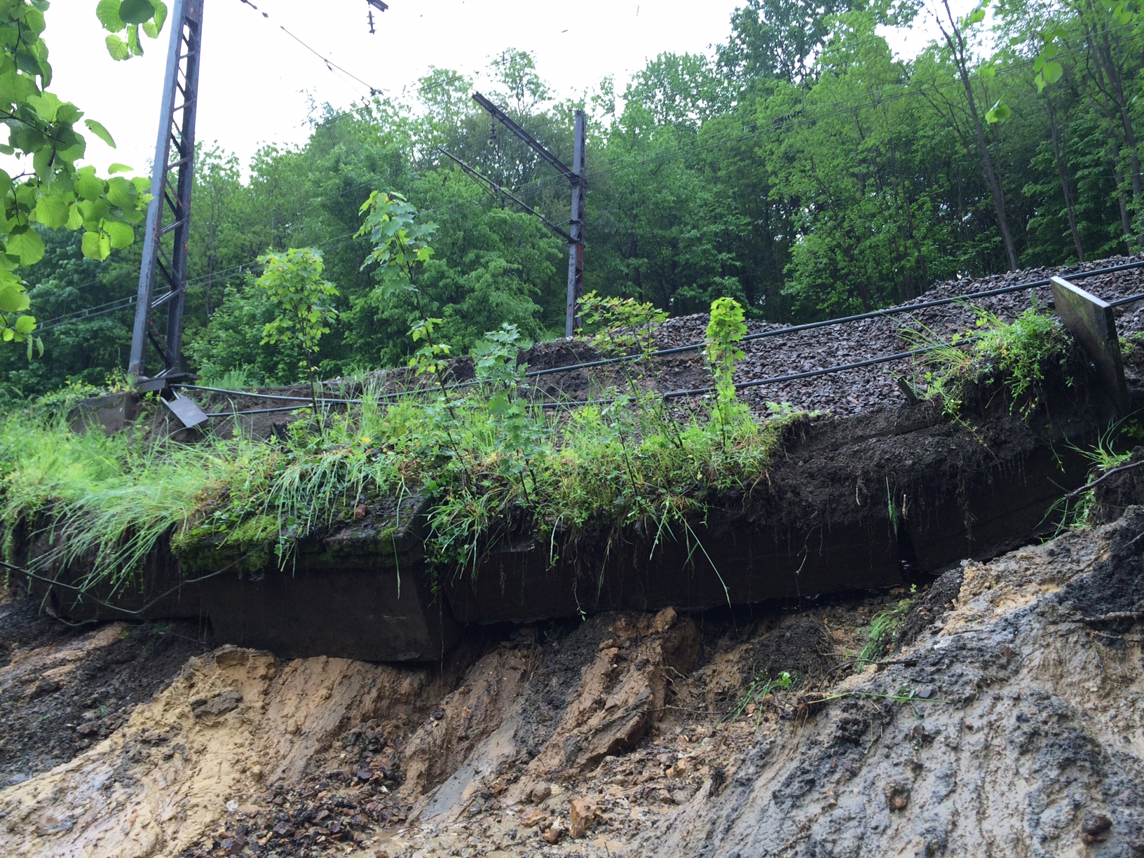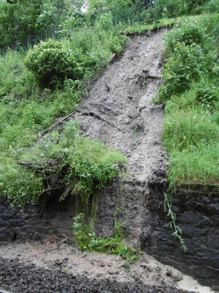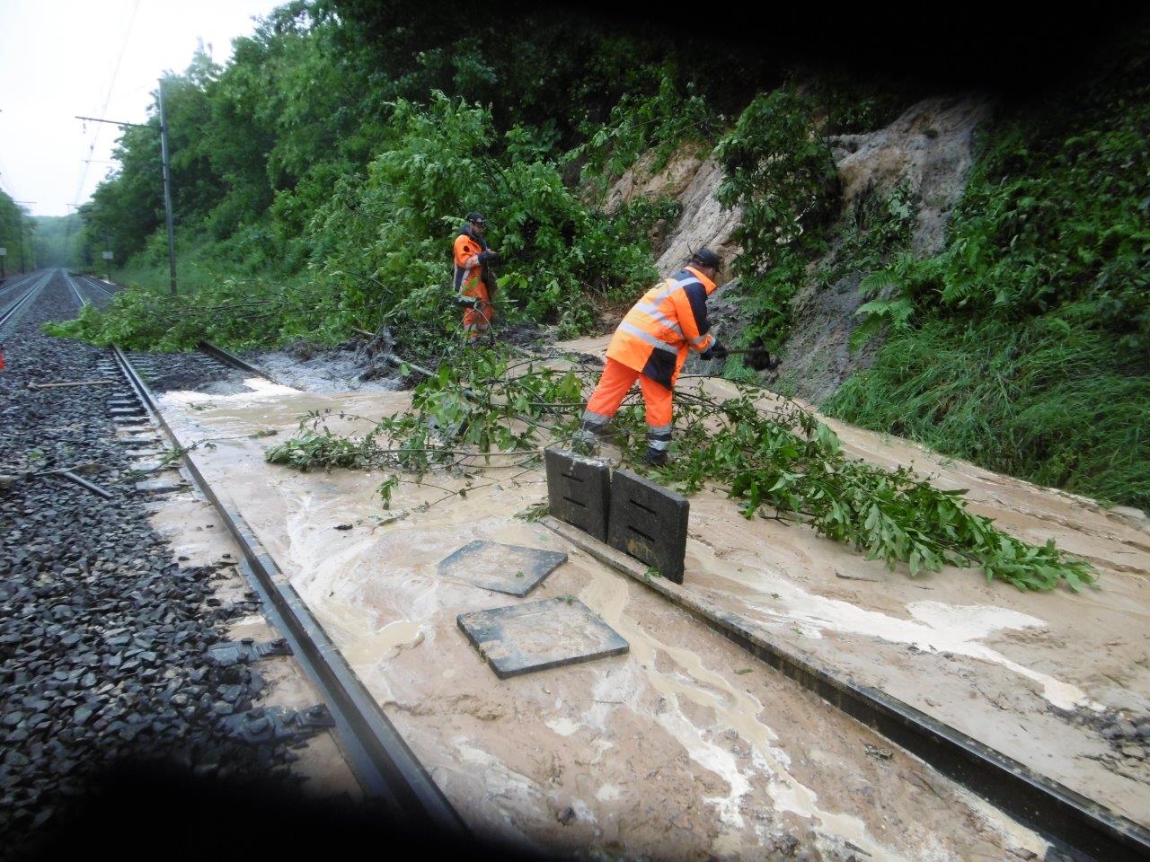 Les fortes pluies et orages qui ont lieu ces derniers jours provoquent actuellement d’importants dommages dans toute l’Ile de France. Sur les installations ferroviaires, ces pluies se traduisent par des affaissements de terrain, voire des coulées de boues recouvrant les voies. Sur certains secteurs ce sont les arbres sur les talus et abords qui chutent soit en raison du vent, soit des éboulements de terrain. La structure des voies elle-même est concernée car en cas d’affaissement de terrain, c’est toute la stabilité de la plateforme qui est remise en question (affaissement des voies) et l’ensemble des installations électriques positionnées le long des voies qui se retrouvent noyées.
