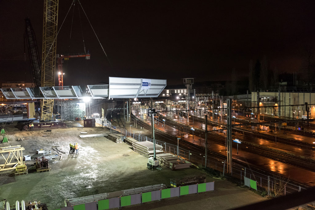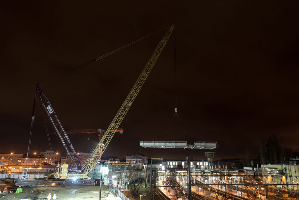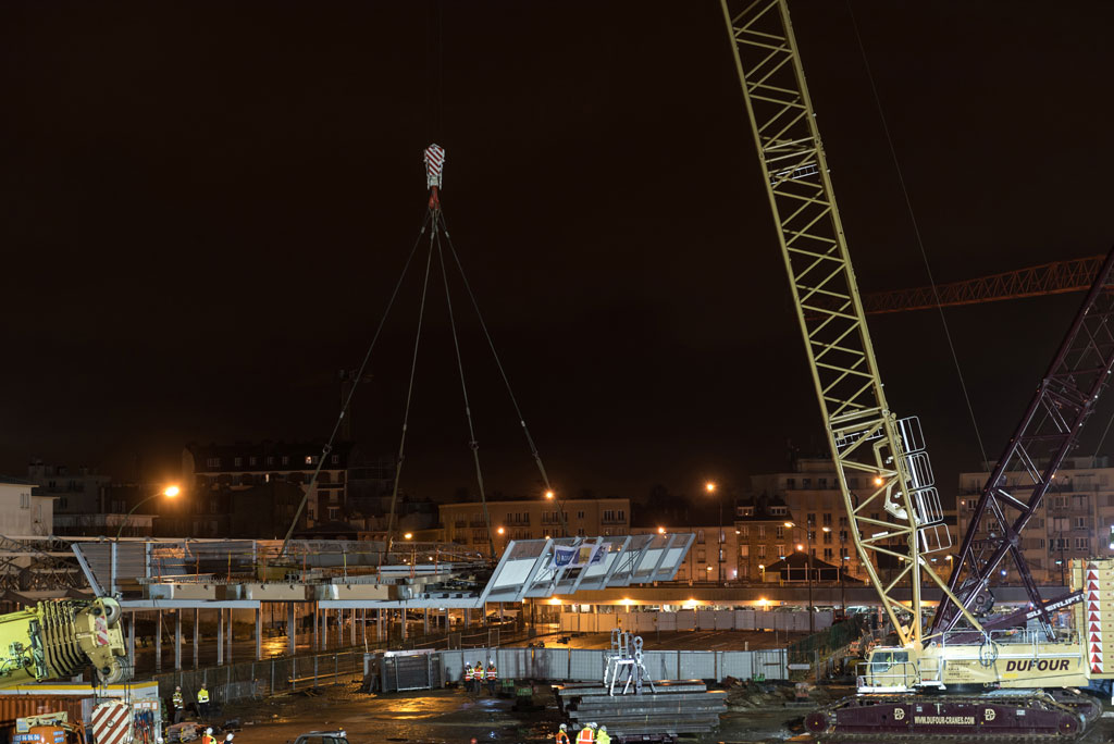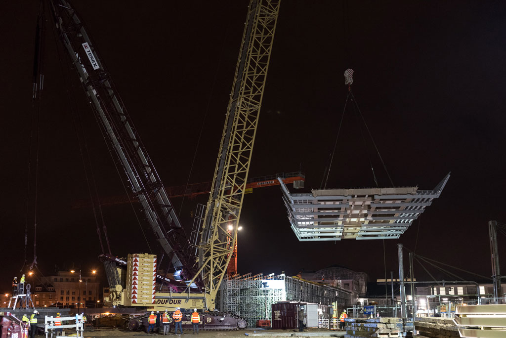 Il ne fallait pas moins que la plus grande gue d’Europe pour pouvoir soulever une telle infrastructure… Composée de deux blocs de 100 tonnes, la passerelle 2 pèse bien 200 tonnes ! Située à 7,5 mètres du sol, la pose de cette passerelle fut une opération délicate tant par le poids phénoménale de la plateforme que par la précision requise pour pouvoir assembler les deux morceaux de passerelle. En effet, l’ajustement des deux blocs constituant la plateforme nécessitait une précision à 2 millimètres près !