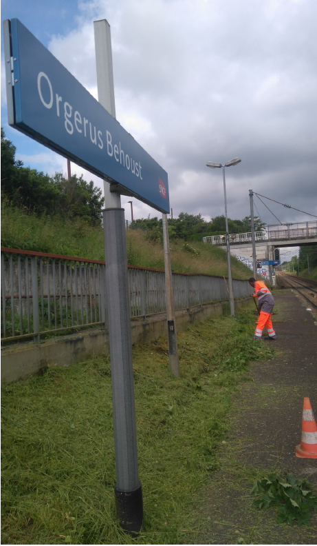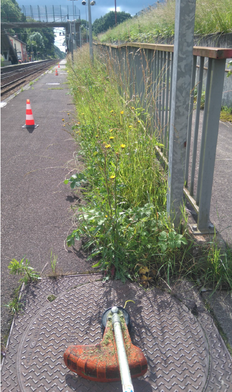 Fauche des espaces enherbés des gares ainsi que le ramassage et l’évacuation des déchets verts après la taille.