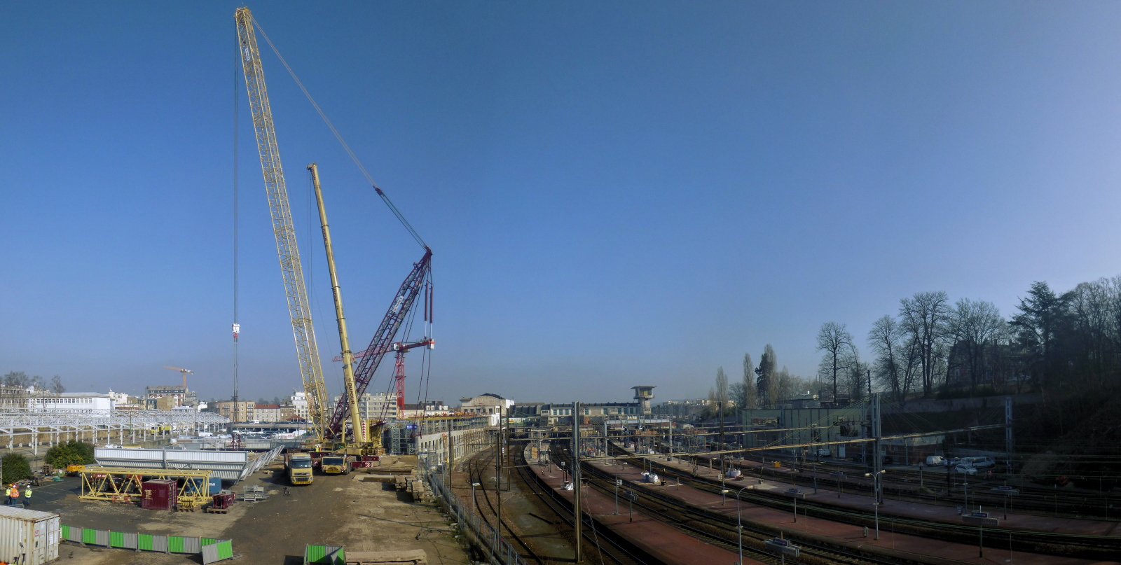 zzezPour transporter la plateforme de la passerelle 2 de la gare de Versailles Chantiers, il a fallu la mobilisation de l’une des plus grandes grues d’Europe !La « méga-grue » mérite bien son nom ! Imaginez son poids…! 650 tonnes soit 3,25 fois plus lourd que le poids d’une baleine bleue !