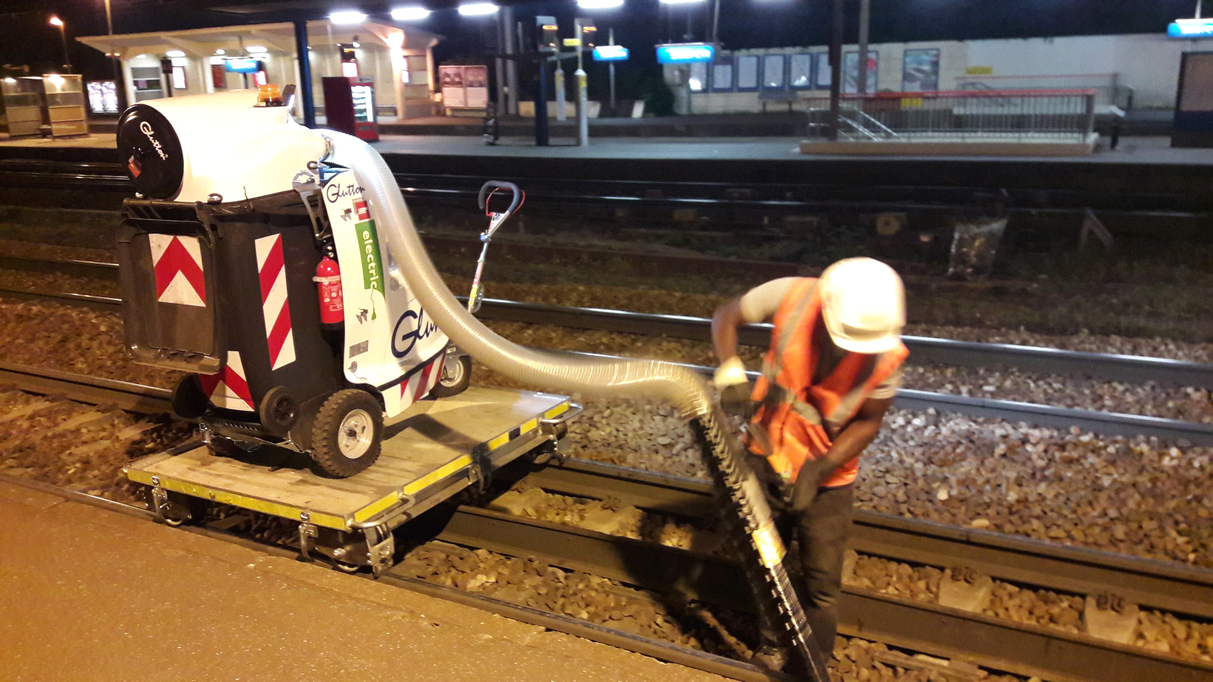 Le Glutton permet de nettoyer les voies sans enlever le ballast: mégots, bouteilles, déchets divers… tout est aspiré pour faire place nette ! Il possède un conteneur de 240 litres pour tout aspirer. C’est un peu comme votre aspirateur ménager mais… en un peu plus gros !