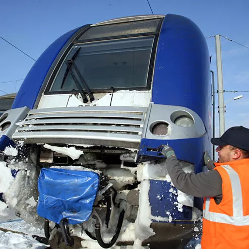 - Conducteurs et agents du matériel qui acheminement vers les sites de garage enneigés et assurent la mise en service des trains malgré des conditions complexes.