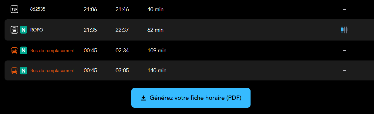 Vous pouvez aussi télécharger les PDF des fiches horaires en cliquant directement sur « Générez votre fiche horaire »: